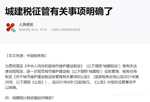 為貫徹落實(shí)《中華人民共和國城市維護(hù)建設(shè)稅法》(以下簡稱“城建稅法”)等有關(guān)法律法規(guī)規(guī)定,進(jìn)一步規(guī)范城市維護(hù)建設(shè)稅(以下簡稱“城建稅”)征收管理,稅務(wù)總局制發(fā)《關(guān)于城市維護(hù)建設(shè)稅征收管理有關(guān)事項(xiàng)的公告》(國家稅務(wù)總局公告2021年第26號(hào),以下簡稱《公告》),自2021年9月1日起施行。《公告》對(duì)相關(guān)征管事項(xiàng)予以明確。 問:城建稅計(jì)稅依據(jù)如何確定? 答:根據(jù)城建稅法等相關(guān)政策規(guī)定,城建稅計(jì)稅依據(jù)為納稅人依法實(shí)際繳納的兩稅稅額。 依法實(shí)際繳納的增值稅稅額,是指納稅人依照增值稅相關(guān)法律法規(guī)和稅收政策規(guī)定計(jì)算應(yīng)當(dāng)繳納的增值稅稅額,加上增值稅免抵稅額,扣除直接減免的增值稅稅額和期末留抵退稅退還的增值稅稅額(以下簡稱“留抵退稅額”)后的金額。 依法實(shí)際繳納的消費(fèi)稅稅額,是指納稅人依照消費(fèi)稅相關(guān)法律法規(guī)和稅收政策規(guī)定計(jì)算應(yīng)當(dāng)繳納的消費(fèi)稅稅額,扣除直接減免的消費(fèi)稅稅額后的金額; 具體計(jì)算公式如下: 城建稅計(jì)稅依據(jù)=依法實(shí)際繳納的增值稅稅額+依法實(shí)際繳納的消費(fèi)稅稅額; 依法實(shí)際繳納的增值稅稅額=納稅人依照增值稅相關(guān)法律法規(guī)和稅收政策規(guī)定計(jì)算應(yīng)當(dāng)繳納的增值稅稅額+增值稅免抵稅額-直接減免的增值稅稅額-留抵退稅額; 依法實(shí)際繳納的消費(fèi)稅稅額=納稅人依照消費(fèi)稅相關(guān)法律法規(guī)和稅收政策規(guī)定計(jì)算應(yīng)當(dāng)繳納的消費(fèi)稅稅額-直接減免的消費(fèi)稅稅額。 【例1】位于某市市區(qū)的甲企業(yè)(城建稅適用稅率為7%),2021年10月申報(bào)期,享受直接減免增值稅優(yōu)惠(不包含先征后退、即征即退,下同)后申報(bào)繳納增值稅50萬元,9月已核準(zhǔn)增值稅免抵稅額10萬元(其中涉及出口貨物6萬元,涉及增值稅零稅率應(yīng)稅服務(wù)4萬元),9月收到增值稅留抵退稅額5萬元,該企業(yè)10月應(yīng)申報(bào)繳納的城建稅為:(50+6+4-5)×7%=3.85(萬元)。 【例2】位于某縣縣城的乙企業(yè)(城建稅適用稅率為5%),2021年10月申報(bào)期,享受直接減免增值稅優(yōu)惠后申報(bào)繳納增值稅90萬元,享受直接減免消費(fèi)稅優(yōu)惠后申報(bào)繳納消費(fèi)稅30萬元,該企業(yè)10月應(yīng)申報(bào)繳納的城建稅為:(90+30)×5%=6(萬元)。 問:所有兩稅稅額是否都納入城建稅計(jì)稅依據(jù)? 答:不是。納稅人因進(jìn)口貨物或境外單位和個(gè)人向境內(nèi)銷售勞務(wù)、服務(wù)、無形資產(chǎn)繳納的兩稅稅額不納入城建稅計(jì)稅依據(jù),不需要繳納城建稅。 【例3】位于某市市區(qū)的甲企業(yè)(城建稅適用稅率為7%),2021年10月申報(bào)期,申報(bào)繳納增值稅100萬元,其中50萬元增值稅是進(jìn)口貨物產(chǎn)生的,該企業(yè)10月應(yīng)申報(bào)繳納的城建稅為:(100-50)×7%=3.5(萬元)。 問:留抵退稅額在城建稅計(jì)稅依據(jù)中扣除有什么具體規(guī)則? 答:納稅人自收到留抵退稅額之日起,應(yīng)當(dāng)在以后納稅申報(bào)期從城建稅計(jì)稅依據(jù)中扣除。 留抵退稅額僅允許在按照增值稅一般計(jì)稅方法確定的城建稅計(jì)稅依據(jù)中扣除。當(dāng)期未扣除完的余額,在以后納稅申報(bào)期按規(guī)定繼續(xù)扣除。 對(duì)于增值稅小規(guī)模納稅人更正、查補(bǔ)此前按照一般計(jì)稅方法確定的城建稅計(jì)稅依據(jù),允許扣除尚未扣除完的留抵退稅額。 【例4】位于某市市區(qū)的甲企業(yè)(城建稅適用稅率為7%),2021年9月收到增值稅留抵退稅200萬元。2021年10月申報(bào)期,申報(bào)繳納增值稅120萬元(其中按照一般計(jì)稅方法100萬元,按照簡易計(jì)稅方法20萬元),該企業(yè)10月應(yīng)申報(bào)繳納的城建稅為:(100-100)×7%+20×7%=1.4(萬元)。 2021年11月申報(bào)期,該企業(yè)申報(bào)繳納增值稅200萬元,均為按照一般計(jì)稅方法產(chǎn)生的,該企業(yè)11月應(yīng)申報(bào)繳納的城建稅為:(200-100)×7%=7(萬元)。 問:城建稅與兩稅如何實(shí)現(xiàn)同征同管? 答:在繳稅環(huán)節(jié),城建稅的納稅義務(wù)發(fā)生時(shí)間與兩稅的納稅義務(wù)發(fā)生時(shí)間一致,分別在繳納兩稅的同一繳納地點(diǎn)、同一繳納期限內(nèi),一并繳納對(duì)應(yīng)的城建稅。委托代征、代扣代繳、代收代繳、預(yù)繳、補(bǔ)繳等方式繳納兩稅的,也應(yīng)當(dāng)同時(shí)繳納城建稅。 需要特別說明的是,城建稅法規(guī)定對(duì)進(jìn)口貨物或者境外單位和個(gè)人向境內(nèi)銷售勞務(wù)、服務(wù)、無形資產(chǎn)繳納的兩稅稅額,不征收城建稅。因此,上述的代扣代繳,不含因境外單位和個(gè)人向境內(nèi)銷售勞務(wù)、服務(wù)、無形資產(chǎn)代扣代繳增值稅情形。 在退稅環(huán)節(jié),因納稅人多繳發(fā)生的兩稅退稅,同時(shí)退還已繳納的城建稅。但是,兩稅實(shí)行先征后返、先征后退、即征即退的,除另有規(guī)定外,不予退還隨兩稅附征的城建稅!傲碛幸(guī)定”主要指在增值稅實(shí)行即征即退等情形下,城建稅可以給予免稅的特殊規(guī)定,比如,《財(cái)政部 國家稅務(