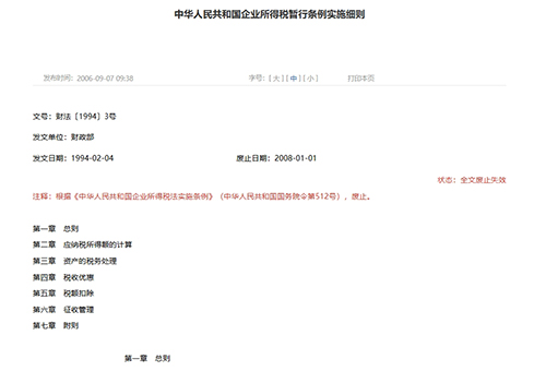 第一條 中華人民共和國(guó)境內(nèi)的企業(yè),除外商投資企業(yè)和外國(guó)企業(yè)外,應(yīng)當(dāng)就其生產(chǎn)、經(jīng)營(yíng)所得和其他所得,依照本條例繳納企業(yè)所得稅。 企業(yè)的生產(chǎn)、經(jīng)營(yíng)所得和其他所得,包括來(lái)源于中國(guó)境內(nèi)、境外的所得。 第二條 下列實(shí)行獨(dú)立經(jīng)濟(jì)核算的企業(yè)或者組織,為企業(yè)所得稅的納稅義務(wù)人(以下簡(jiǎn)稱納稅人): (一)國(guó)有企業(yè); (二)集體企業(yè); (三)私營(yíng)企業(yè); (四)聯(lián)營(yíng)企業(yè); (五)股份制企業(yè); (六)有生產(chǎn)、經(jīng)營(yíng)所得和其他所得的其他組織。 第三條 納稅人應(yīng)納稅額,按應(yīng)納稅所得額計(jì)算,稅率為33%。 第四條 納稅人每一納稅年度的收入總額減去準(zhǔn)予扣除項(xiàng)目后的余額為應(yīng)納稅所得額。 第五條 納稅人的收入總額包括: (一)生產(chǎn)、經(jīng)營(yíng)收入; (二)財(cái)產(chǎn)轉(zhuǎn)讓收入; (三)利息收入; (四)租賃收入; (五)特許權(quán)使用費(fèi)收入; (六)股息收入; (七)其他收入。 第六條 計(jì)算應(yīng)納稅所得額時(shí)準(zhǔn)予扣除的項(xiàng)目,是指與納稅人取得收入有關(guān)的成本、費(fèi)用和損失。 下列項(xiàng)目,按照規(guī)定的范圍、標(biāo)準(zhǔn)扣除: (一)納稅人在生產(chǎn)、經(jīng)營(yíng)期間,向金融機(jī)構(gòu)借款的利息支出,按照實(shí)際發(fā)生數(shù)扣除;向非金融機(jī)構(gòu)借款的利息支出,不高于按照金融機(jī)構(gòu)同類(lèi)、同期貸款利率計(jì)算的數(shù)額以內(nèi)的部分,準(zhǔn)予扣除。 (二)納稅人支付給職工的工資,按照計(jì)稅工資扣除。計(jì)稅工資的具體標(biāo)準(zhǔn),在財(cái)政部規(guī)定的范圍內(nèi),由省、自治區(qū)、直轄市人民政府規(guī)定,報(bào)財(cái)政部備案。 (三)納稅人的職工工會(huì)經(jīng)費(fèi)、職工福利費(fèi)、職工教育經(jīng)費(fèi),分別按照計(jì)稅工資總額的2%、14%、1.5%計(jì)算扣除。 (四)納稅人用于公益、救濟(jì)性的捐贈(zèng),在年度應(yīng)納稅所得額3%以內(nèi)的部分,準(zhǔn)予扣除。 除本條第二款規(guī)定外,其他項(xiàng)目,依照法律、行政法規(guī)和國(guó)家有關(guān)稅收的規(guī)定扣除。 第七條 在計(jì)算應(yīng)納稅所得額時(shí),下列項(xiàng)目不得扣除: (一)資本性支出; (二)無(wú)形資產(chǎn)受讓、開(kāi)發(fā)支出; (三)違法經(jīng)營(yíng)的罰款和被沒(méi)收財(cái)物的損失; (四)各項(xiàng)稅收的滯納金、罰金和罰款; (五)自然災(zāi)害或者意外事故損失有賠償?shù)牟糠郑?/div> (六)超過(guò)國(guó)家規(guī)定允許扣除的公益、救濟(jì)性捐贈(zèng),以及非公益、救濟(jì)性的捐贈(zèng); (七)各種贊助支出; (八)與取得收入無(wú)關(guān)的其他各項(xiàng)支出。 第八條 對(duì)下列納稅人,實(shí)行稅收優(yōu)惠政策: (一)民族自治地方的企業(yè),需要照顧和鼓勵(lì)的,經(jīng)省級(jí)人民政府批準(zhǔn),可以實(shí)行定期減稅或者免稅; (二)法律、行政法規(guī)和國(guó)務(wù)院有關(guān)規(guī)定給予減稅或者免稅的企業(yè),依照規(guī)定執(zhí)行。 第九條 納稅人在計(jì)算應(yīng)納稅所得額時(shí),其財(cái)務(wù)、會(huì)計(jì)處理辦法同國(guó)家有關(guān)稅收的規(guī)定有抵觸的,應(yīng)當(dāng)依照國(guó)家有關(guān)稅收的規(guī)定計(jì)算納稅。 第十條 納稅人與其關(guān)聯(lián)企業(yè)之間的業(yè)務(wù)往來(lái),應(yīng)當(dāng)按照獨(dú)立企業(yè)之間的業(yè)務(wù)往來(lái)收取或者支付價(jià)款、費(fèi)用。不按照獨(dú)立企業(yè)之間的業(yè)務(wù)往來(lái)收取或者支付價(jià)款、費(fèi)用,而減少其應(yīng)納稅所得額的,稅務(wù)機(jī)關(guān)有權(quán)進(jìn)行合理調(diào)整。 第十一條 納稅人發(fā)生年度虧損的,可以用下一納稅年度的所得彌補(bǔ);下一納稅年度的所得不足彌補(bǔ)的,可以逐年延續(xù)彌補(bǔ),但是延續(xù)彌補(bǔ)期最長(zhǎng)不得超過(guò)五年。 第十二條 納稅人來(lái)源于中國(guó)境外的所得,已在境外繳納的所得稅稅款,準(zhǔn)予在匯總納稅時(shí),從其應(yīng)納稅額中扣除,但是扣除額不得超過(guò)其境外所得依照本條例規(guī)定計(jì)算的應(yīng)納稅額。 第十三條 納稅人依法進(jìn)行清算時(shí),其清算終了后的清算所得,應(yīng)當(dāng)依照本條例規(guī)定繳納企業(yè)所得稅。 第十四條 除國(guó)家另有規(guī)定外,企業(yè)所得稅由納稅人向其所在地主管稅務(wù)機(jī)關(guān)繳納。 第十五條 繳納企業(yè)所得稅,按年計(jì)算,分月或者分季預(yù)繳。月份或者季度終了后十五日內(nèi)預(yù)繳,年度終了后四個(gè)月內(nèi)匯算清繳,多退少補(bǔ)。 第十六條 納稅人應(yīng)當(dāng)在月份或者季度終了后十五日內(nèi),向其所在地主管稅務(wù)機(jī)關(guān)報(bào)送會(huì)計(jì)報(bào)表和預(yù)繳所得稅申報(bào)表;年度終了后四十五日內(nèi),向其所在地主管稅務(wù)機(jī)關(guān)報(bào)送會(huì)計(jì)決算報(bào)表和所得稅申報(bào)表。 第十七條 企業(yè)所得稅的征收管理,依照《中華人民共和國(guó)稅收征收管理法》及本條例有關(guān)規(guī)定執(zhí)行。 第十八條 金融