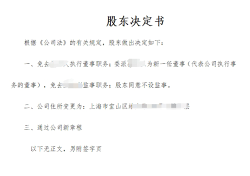 注意:本示范文本不得手工填寫,打印時(shí)應(yīng)當(dāng)刪除文本中紅色字體部分。 不設(shè)董事會(huì)設(shè)監(jiān)事會(huì)一人有限公司股東決定樣本:開業(yè) 股東決定 根據(jù)《公司法》規(guī)定,股東做出決定如下: 一、通過(guò)《上海____________________公司章程》。 二、任命______________為公司第一屆執(zhí)行董事。 三、聘任______________為公司經(jīng)理。① 四、任命_______________、_______________為公司監(jiān)事會(huì)監(jiān)事。由于公司尚未設(shè)立登記,暫缺職工監(jiān)事 名,待公司成立后通過(guò)章程規(guī)定的方式選舉產(chǎn)生,再到公司登記機(jī)關(guān)予以備案。② 五、同意設(shè)立上海___________________公司,并擬向公司登記機(jī)關(guān)申請(qǐng)?jiān)O(shè)立登記。 股東(簽字、蓋章) 年 月 日 —————————————————————————————————— 注:①執(zhí)行董事可以兼任公司經(jīng)理。不設(shè)經(jīng)理的此款取消。 ②監(jiān)事會(huì)成員為3人以上,且必須有不少于1/3的由職工通過(guò)職工代表大會(huì)、職工大會(huì)或其他形式民主選舉產(chǎn)生的職工代表(具體比例和選舉方式由章程規(guī)定)。董事、經(jīng)理、副經(jīng)理、財(cái)務(wù)負(fù)責(zé)人和公司章程規(guī)定的其他高級(jí)管理人員不得兼任監(jiān)事。 |