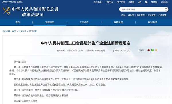 | 中華人民共和國進口食品境外生產企業(yè)注冊管理規(guī)定 第一章 總則 第一條 為加強進口食品境外生產企業(yè)的注冊管理,根據《中華人民共和國食品安全法》及其實施條例、《中華人民共和國進出口商品檢驗法》及其實施條例、《中華人民共和國進出境動植物檢疫法》及其實施條例、《國務院關于加強食品等產品安全監(jiān)督管理的特別規(guī)定》等法律、行政法規(guī)的規(guī)定,制定本規(guī)定。 第二條 向中國境內出口食品的境外生產、加工、貯存企業(yè)(以下統稱進口食品境外生產企業(yè))的注冊管理適用本規(guī)定。 前款規(guī)定的進口食品境外生產企業(yè)不包括食品添加劑、食品相關產品的生產、加工、貯存企業(yè)。 第三條 海關總署統一負責進口食品境外生產企業(yè)的注冊管理工作。 第四條 進口食品境外生產企業(yè),應當獲得海關總署注冊。 第二章 注冊條件與程序 第五條 進口食品境外生產企業(yè)注冊條件: (一)所在國家(地區(qū))的食品安全管理體系通過海關總署等效性評估、審查; (二)經所在國家(地區(qū))主管當局批準設立并在其有效監(jiān)管下; (三)建立有效的食品安全衛(wèi)生管理和防護體系,在所在國家(地區(qū))合法生產和出口,保證向中國境內出口的食品符合中國相關法律法規(guī)和食品安全國家標準; (四)符合海關總署與所在國家(地區(qū))主管當局商定的相關檢驗檢疫要求。 第六條 進口食品境外生產企業(yè)注冊方式包括所在國家(地區(qū))主管當局推薦注冊和企業(yè)申請注冊。 海關總署根據對食品的原料來源、生產加工工藝、食品安全歷史數據、消費人群、食用方式等因素的分析,并結合國際慣例確定進口食品境外生產企業(yè)注冊方式和申請材料。 經風險分析或者有證據表明某類食品的風險發(fā)生變化的,海關總署可以對相應食品的境外生產企業(yè)注冊方式和申請材料進行調整。 第七條 下列食品的境外生產企業(yè)由所在國家(地區(qū))主管當局向海關總署推薦注冊:肉與肉制品、腸衣、水產品、乳品、燕窩與燕窩制品、蜂產品、蛋與蛋制品、食用油脂和油料、包餡面食、食用谷物、谷物制粉工業(yè)產品和麥芽、保鮮和脫水蔬菜以及干豆、調味料、堅果與籽類、干果、未烘焙的咖啡豆與可可豆、特殊膳食食品、保健食品。 第八條 所在國家(地區(qū))主管當局應當對其推薦注冊的企業(yè)進行審核檢查,確認符合注冊要求后,向海關總署推薦注冊并提交以下申請材料: (一)所在國家(地區(qū))主管當局推薦函; (二)企業(yè)名單與企業(yè)注冊申請書; (三)企業(yè)身份證明文件,如所在國家(地區(qū))主管當局頒發(fā)的營業(yè)執(zhí)照等; (四)所在國家(地區(qū))主管當局推薦企業(yè)符合本規(guī)定要求的聲明; (五)所在國家(地區(qū))主管當局對相關企業(yè)進行審核檢查的審查報告。 必要時,海關總署可以要求提供企業(yè)食品安全衛(wèi)生和防護體系文件,如企業(yè)廠區(qū)、車間、冷庫的平面圖,以及工藝流程圖等。 第九條 本規(guī)定第七條所列食品以外的其他食品境外生產企業(yè),應當自行或者委托代理人向海關總署提出注冊申請并提交以下申請材料: (一)企業(yè)注冊申請書; (二)企業(yè)身份證明文件,如所在國家(地區(qū))主管當局頒發(fā)的營業(yè)執(zhí)照等; (三)企業(yè)承諾符合本規(guī)定要求的聲明。 第十條 企業(yè)注冊申請書內容應當包括企業(yè)名稱、所在國家(地區(qū))、生產場所地址、法定代表人、聯系人、聯系方式、所在國家(地區(qū))主管當局批準的注冊編號、申請注冊食品種類、生產類型、生產能力等信息。 第十一條 注冊申請材料應當用中文或者英文提交,相關國家(地區(qū))與中國就注冊方式和申請材料另有約定的,按照雙方約定執(zhí)行。 第十二條 所在國家(地區(qū))主管當局或進口食品境外生產企業(yè)應當對提交材料的真實性、完整性、合法性負責。 第十三條 海關總署自行或者委托有關機構組織評審組,通過書面檢查、視頻檢查、現場檢查等形式及其組合,對申請注冊的進口食品境外生產企業(yè)實施評估審查。評審組由2名以上評估審查人員組成。 進口食品境外生產企業(yè)和所在國家(地區(qū))主管當局應當協助開展上述評估審查工作。 第十四條 海關總署根據評估審查情況,對符合要求的進口食品境外生產企業(yè)予以注冊并給予在華注冊編號,書面通知所在國家(地區(qū))主管當局或進口食品境外生產企業(yè);對不符合要求的進口食品境外生產企業(yè)不予注冊,書面通知所在國家(地區(qū))主管當局或進口食品境外生產企業(yè)。 第十五條 已獲得注冊的企業(yè)向中國境內出口食品時,應當在食品的內、外包裝上標注在華注冊編號或者所在國家(地區(qū))主管當局批準的注冊編號。 第十六條 進口食品境外生產企業(yè)注冊有效期為5年。 海關總署在對進口食品境外生產企業(yè)予以注冊時,應當確定注冊有效期起止日期。 第十七條 海關總署統一公布獲得注冊的進口食品境外生產企業(yè)名單。 第三章 注冊管理 第十八條 海關總署自行或者委托有關機構組織評審組,對進口食品境外生產企業(yè)是否持續(xù)符合注冊要求的情況開展復查。評審組由2名以上評估審查人員組成。 第十九條 在注冊有效期內,