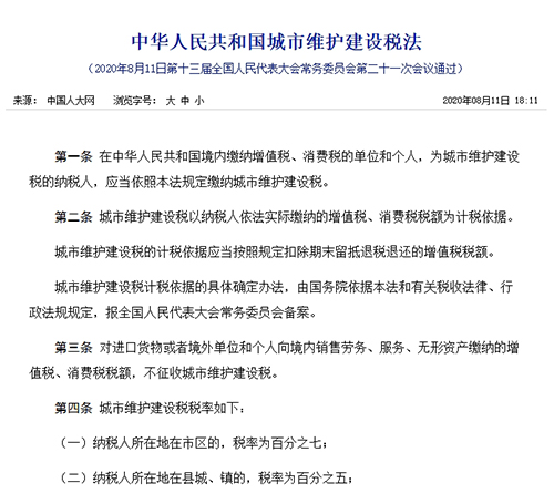 中華人民共和國城市維護(hù)建設(shè)稅法 第一條 在中華人民共和國境內(nèi)繳納增值稅、消費(fèi)稅的單位和個(gè)人,為城市維護(hù)建設(shè)稅的納稅人,應(yīng)當(dāng)依照本法規(guī)定繳納城市維護(hù)建設(shè)稅。 第二條 城市維護(hù)建設(shè)稅以納稅人依法實(shí)際繳納的增值稅、消費(fèi)稅稅額為計(jì)稅依據(jù)。 城市維護(hù)建設(shè)稅的計(jì)稅依據(jù)應(yīng)當(dāng)按照規(guī)定扣除期末留抵退稅退還的增值稅稅額。 城市維護(hù)建設(shè)稅計(jì)稅依據(jù)的具體確定辦法,由國務(wù)院依據(jù)本法和有關(guān)稅收法律、行政法規(guī)規(guī)定,報(bào)全國人民代表大會常務(wù)委員會備案。 第三條 對進(jìn)口貨物或者境外單位和個(gè)人向境內(nèi)銷售勞務(wù)、服務(wù)、無形資產(chǎn)繳納的增值稅、消費(fèi)稅稅額,不征收城市維護(hù)建設(shè)稅。 第四條 城市維護(hù)建設(shè)稅稅率如下: (一)納稅人所在地在市區(qū)的,稅率為百分之七; (二)納稅人所在地在縣城、鎮(zhèn)的,稅率為百分之五; (三)納稅人所在地不在市區(qū)、縣城或者鎮(zhèn)的,稅率為百分之一。 前款所稱納稅人所在地,是指納稅人住所地或者與納稅人生產(chǎn)經(jīng)營活動(dòng)相關(guān)的其他地點(diǎn),具體地點(diǎn)由省、自治區(qū)、直轄市確定。 第五條 城市維護(hù)建設(shè)稅的應(yīng)納稅額按照計(jì)稅依據(jù)乘以具體適用稅率計(jì)算。 第六條 根據(jù)國民經(jīng)濟(jì)和社會發(fā)展的需要,國務(wù)院對重大公共基礎(chǔ)設(shè)施建設(shè)、特殊產(chǎn)業(yè)和群體以及重大突發(fā)事件應(yīng)對等情形可以規(guī)定減征或者免征城市維護(hù)建設(shè)稅,報(bào)全國人民代表大會常務(wù)委員會備案。 第七條 城市維護(hù)建設(shè)稅的納稅義務(wù)發(fā)生時(shí)間與增值稅、消費(fèi)稅的納稅義務(wù)發(fā)生時(shí)間一致,分別與增值稅、消費(fèi)稅同時(shí)繳納。 第八條 城市維護(hù)建設(shè)稅的扣繳義務(wù)人為負(fù)有增值稅、消費(fèi)稅扣繳義務(wù)的單位和個(gè)人,在扣繳增值稅、消費(fèi)稅的同時(shí)扣繳城市維護(hù)建設(shè)稅。 第九條 城市維護(hù)建設(shè)稅由稅務(wù)機(jī)關(guān)依照本法和《中華人民共和國稅收征收管理法》的規(guī)定征收管理。 第十條 納稅人、稅務(wù)機(jī)關(guān)及其工作人員違反本法規(guī)定的,依照《中華人民共和國稅收征收管理法》和有關(guān)法律法規(guī)的規(guī)定追究法律責(zé)任。 第十一條 本法自2021年9月1日起施行。1985年2月8日國務(wù)院發(fā)布的《中華人民共和國城市維護(hù)建設(shè)稅暫行條例》同時(shí)廢止。 |